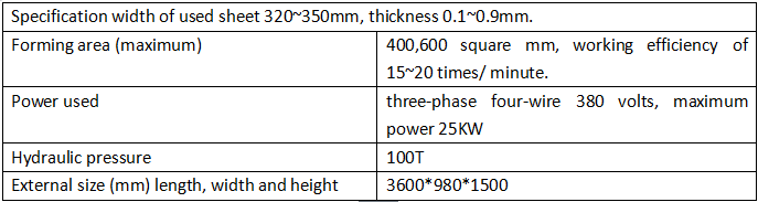 Питомник табақшасын себу Құралдың техникалық параметрі Пайдаланылған парақтың ерекшелігі: 300 ~ 320 мм, қалыңдығы: 0.8 ~ 2 мм. Құрындыратын аудан (максимум): 400 * 600 мм, жұмыс тиімділігі, минут / минут. Пайдаланылған қуат: үш фазалы төрт сым 380 вольт, максималды қуат 25 кВт Гидравликалық қысым: 100т Сыртқы өлшем (мм) ұзындығы, ені және биіктігі) 3600 мм * 980mm * 1500 мм
