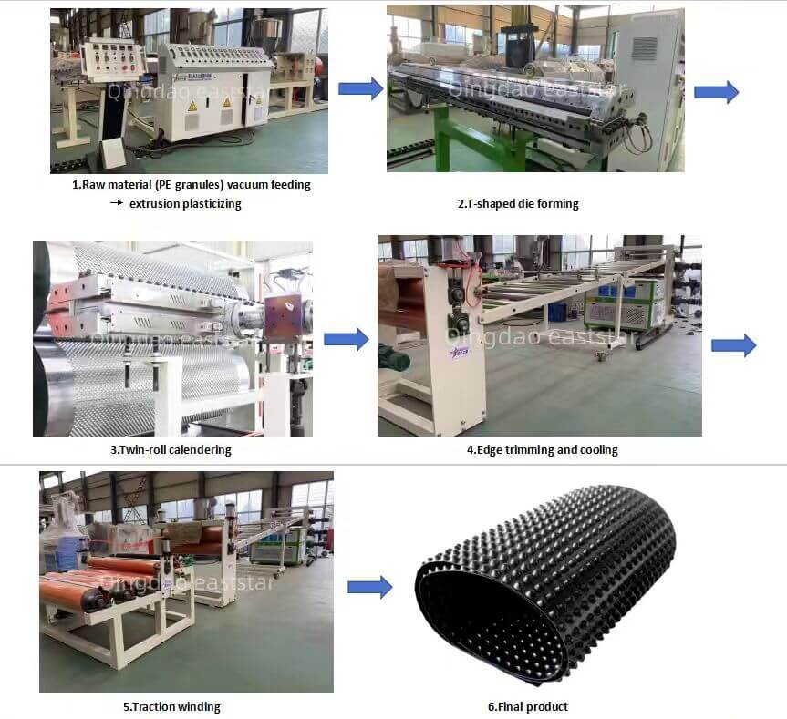 Qingdao Eaststar, терең техникалық сараптаманы кеңейтілген экструзияда қолдану, өнімділігі жоғары дренаждық тақтаның өндіріс желісін іске қосты. Designed specifically for building infrastructure, underground engineering, and landscaping projects, this line utilizes a 105/33 large-diameter single-screw extruder and precision two-roll molding technology to ensure uniform sheet texture and efficient drainage. Сиеменс пен ABB өндірістік процестері мен жоғары деңгейлі электрлік компоненттермен, біз тұтынушыларға өндірістік бәсекеге қабілеттілігін арттыруға және инженерлік материалдардың тұрақты қамтамасыз етілуіне көмектесеміз.