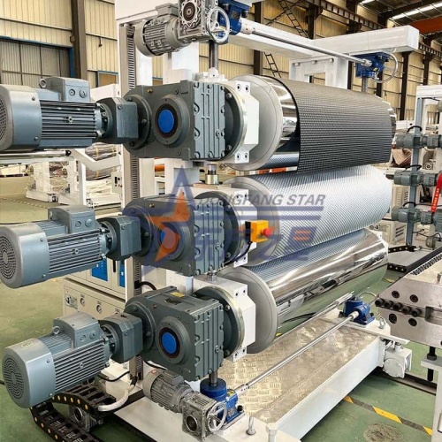 ∮400 мм айнамен қапталған хромдалған каландрлау роликтері (тегістігі Ra≤0,025μm) тәуелсіз үш роликті температураны басқару жүйесімен біріктірілген, TPE материалы үшін дәл қалыптау және салқындату шарттарын қамтамасыз етеді. Механикалық құрт тісті беріліс саңылауын реттеу механизмі материалдың беткі қабатының біркелкі қалыңдығын және тегіс бетін құра отырып, үш роликтің параллельділігін қамтамасыз етеді.